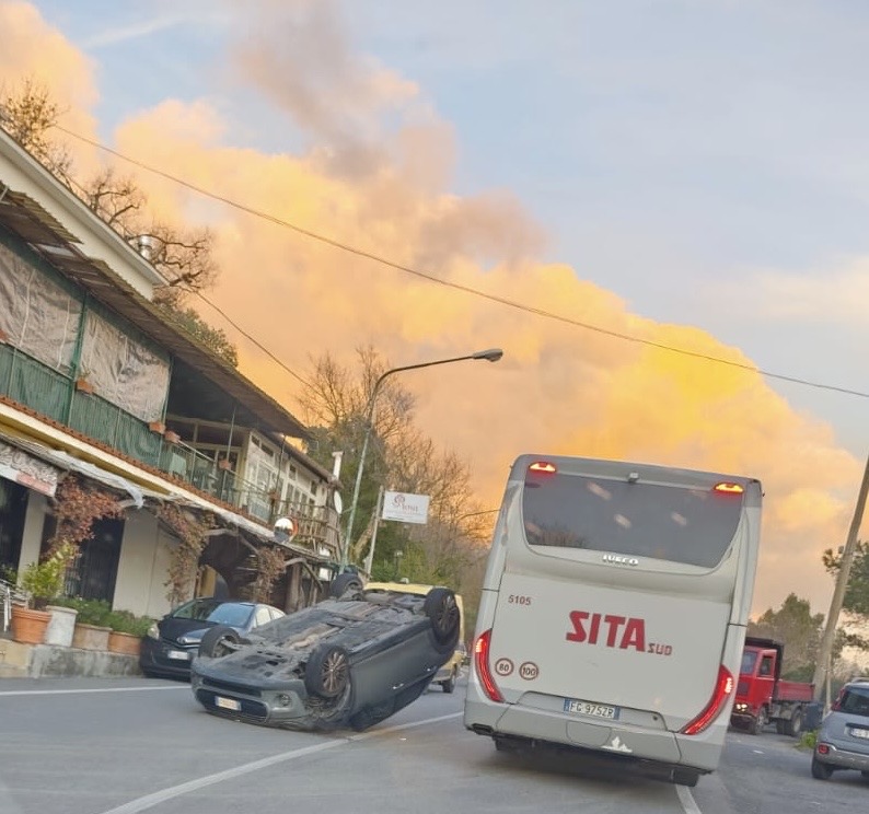 Auto si ribalta al centro della carreggiata mentre percorre la zona collinare della penisola sorrentina. L’incidente nel pomeriggio di oggi ai Colli di San Pietro nel Comune di Piano di Sorrento.